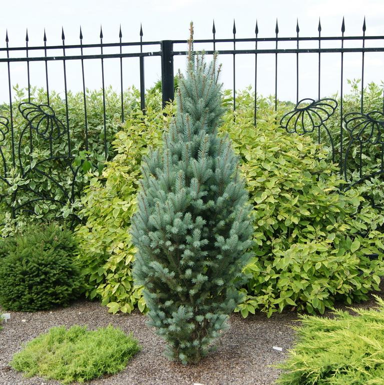 Дерево в зависимости от почвы и ухода достигает до 3-5 м в высоту. Крона аккуратной узкоконической формы, плотная и стройная. Побеги покрыты густой, колючей хвоей сизо-голубого оттенка. Крупномер колючая Iseli Fastigiata за год вырастает на 20 см. Ель любит открытые солнечные участки, хорошо переносит засуху, не терпит переувлажнения. Сорт зимостойкий, хорошо развивается на плодородных почвах. семена используют в одиночных посадках или для создания контрастных групп.