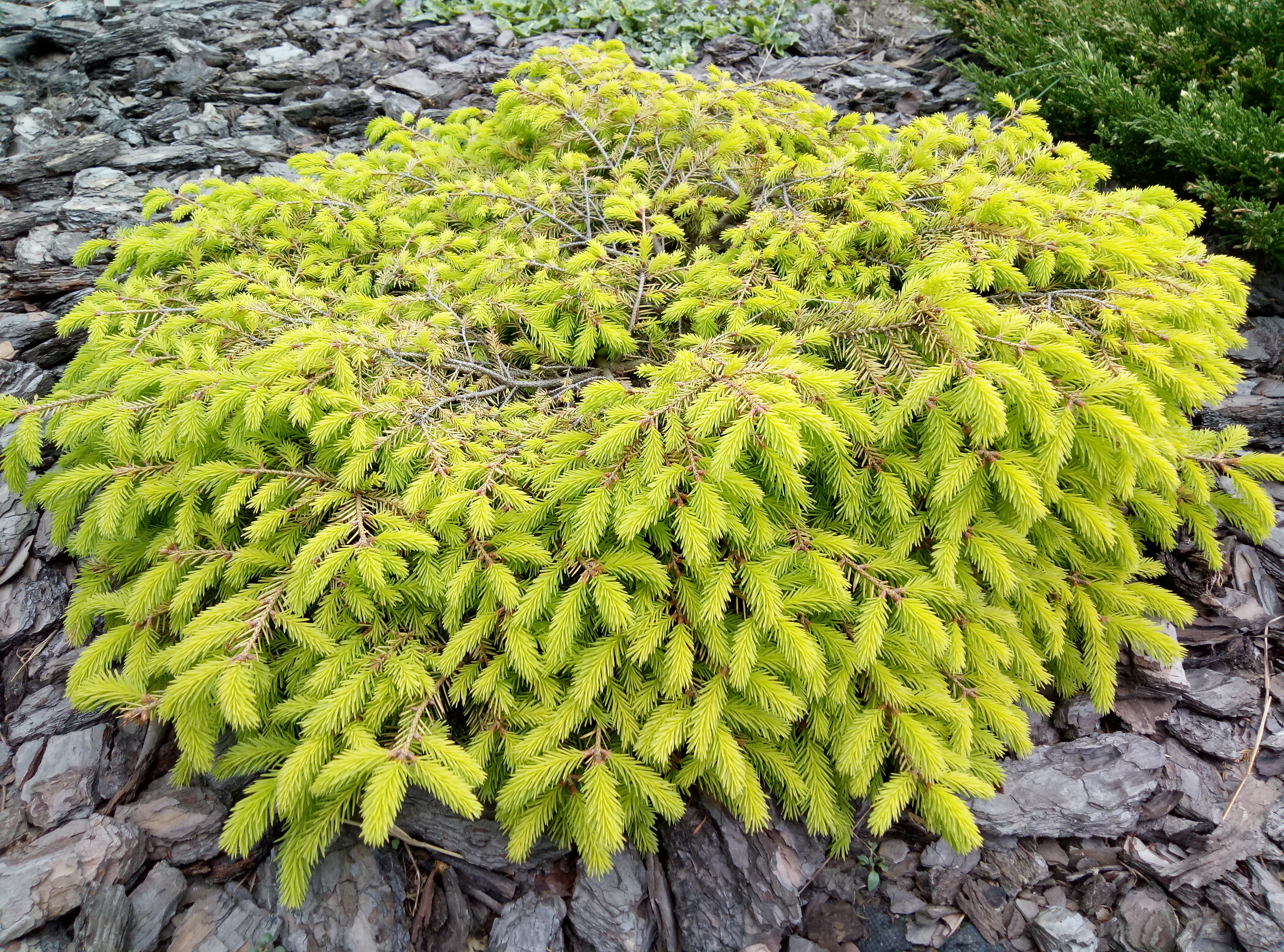 Ель обыкновенная Vermont Gold - очень декоративная карликовая форма ели обыкновенной, растущая вширь больше, чем в высоту.Это новый сорт ели с «лежачими» ветвями, которые образуют плотную, округлую или подушковидную крону. Побеги короткие. Нет центрального проводника ветвей. Растение достигает в высоту 1 м и 1,5 м в диаметре. Растет медленно годовой прирост 5 - 7 см. Молодые приросты золотисто-жёлтого цвета, взрослая хвоя – зеленовато-жёлтая. Этот интересный желтый цвет проявляется, если ель растёт на солнечном месте. В полутени или тени окраска хвои зеленая. Шишки небольшие, в созревшем состоянии коричневые. Появляются на растении поздно, после 10 - 15 лет жизни.